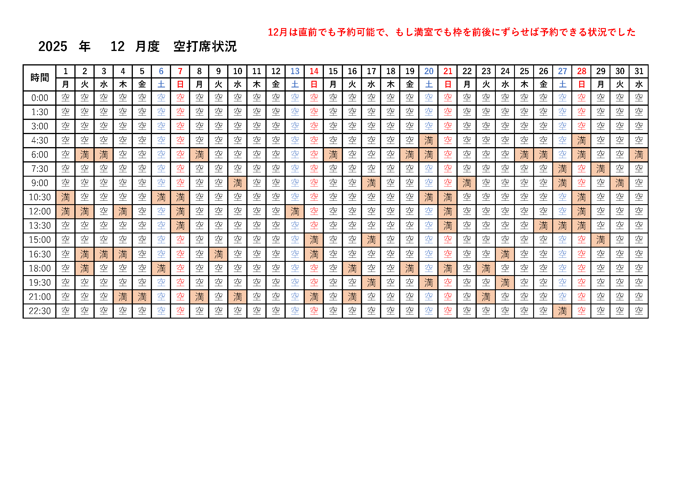 ①予約が取り難くならない様に対応しております。満席状況をこちらで公開しておりますので通いたい時間帯や曜日をご確認ください。