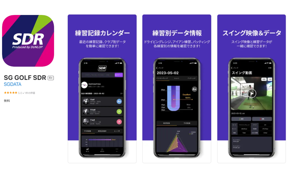 SDR専用アプリ「SG GOLF SDR」をご利用いただく事で練習データをスマホのアプリで閲覧する事ができます。アプリから確認できるデータは、クラブ別平均飛距離やスイング動画の分析、ラウンド記録の確認などが可能です。